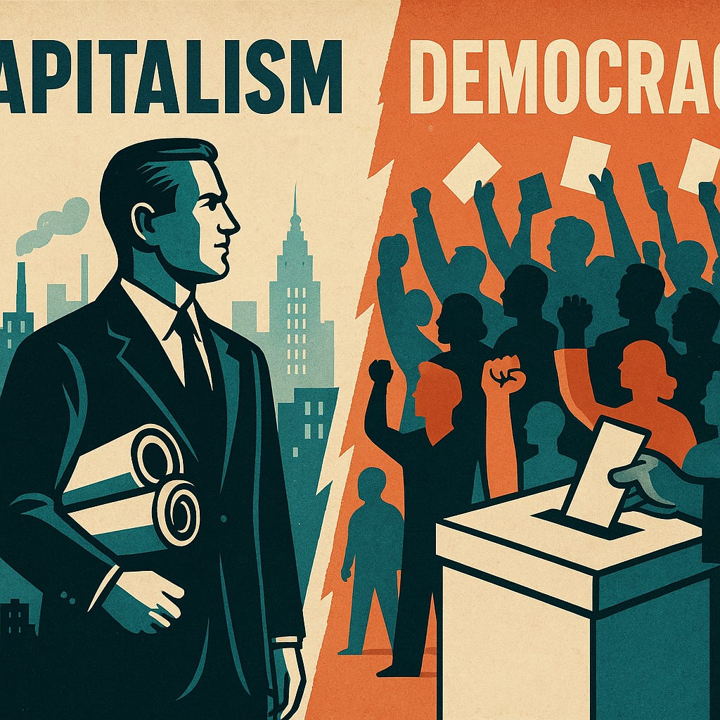 Yet many historians obscure this. They often frame the explosion of American wealth, productivity, and industrial growth in the 19th century as a threat to democracy—as if economic advancement stood in tension with political justice. In this framing, “democracy” is reduced to universal suffrage and vague notions of popular inclusion, while capitalism becomes a stand-in for inequality, exploitation, or unchecked power. This false dichotomy—capitalism vs. democracy—serves to denigrate capitalism’s moral and historical achievements while smuggling in anti-capitalist ideas under the banner of egalitarian justice.